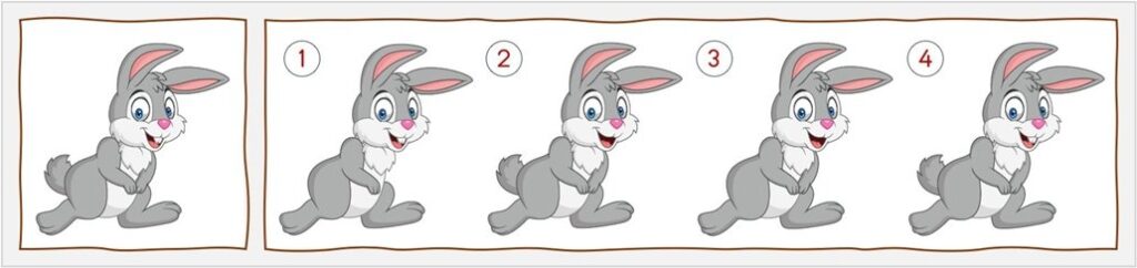 Birinci tavşanın kuyruğu olmadığı için başta verilen görselin eşi olamaz. İkinci tavşanın da dişleri yok. O halde ikinci tavşan da elendi. Üçüncü tavşanın hem dişleri hem de kuyruğu yok. Üçüncü tavşan da baştaki tavşanın eşi olamaz. Dördüncü tavşan baştaki tavşan ile büyüklük, renk, biçim ve sayı olarak aynı olduğu için eştir.