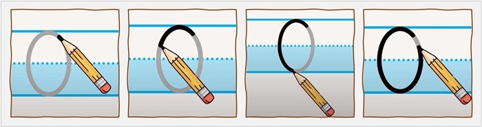0 rakamını yazarken ilk önce üst çizginin hemen altından yumurtaya benzer bir yuvarlak çizelim. Yuvarlak üst ve alt çizgilerin arasında olmalı. 0 rakamını yazarken elimizi hiç kaldırmıyoruz.