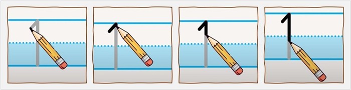 1 rakamını yazarken önce sağa ve yukarıya doğru bir çizgi çizelim. Üst kalın çizgiye ulaşınca elimizi kaldırmadan alt kalın çizgiye kadar dik bir çizgi daha çizelim. 1 rakamını yazarken elimizi hiç kaldırmayalım.