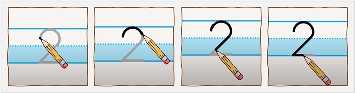 2 rakamını yazarken önce yukarıdan sağa doğru kıvrılan bir yay çizelim. Daha sonra alttaki kalın çizgiye kadar eğik bir çizgi çizelim. En son sağa doğru yatay bir çizgi daha çizelim. 2 rakamını yazarken elimizi hiç kaldırmayalım.