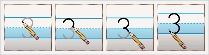 3 rakamını yazarken ilk önce sağdan yukarıya doğru kıvrılan bir yay çizelim. Yayımızı ortadaki kesik çizgilere kadar getirelim. Aynı şekilde alt kısma da benzer bir yay çizelim. 3 rakamını yazarken elimizi hiç kaldırmayalım.