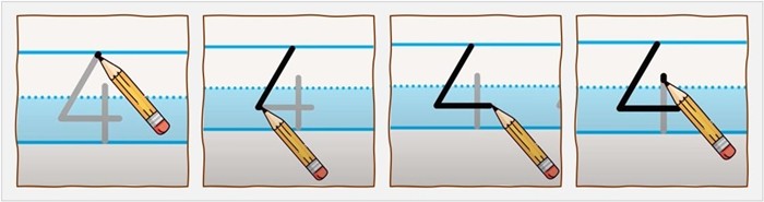 4 rakamını yazarken ilk önce yukarıdan sola ve aşağıya doğru bir eğik çizgi çizelim. Elimizi kaldırmadan sola doğru yatay bir çizgi çizelim. Son olarak da yukarıdan aşağıya doğru dik çizgimizi çizelim. 4 rakamını yazarken elimizi bir defa kaldırıyoruz.
