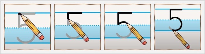 5 rakamını yazarken ilk önce üst çizgiden başlayarak soldan sağa doğru bir çizgi çizelim. Elimizi kaldırıp başlangıç noktasından ortadaki kesik çizgilere doğru dik bir çizgi daha çizelim. Elimizi kaldırmadan alt çizgiye doğru yuvarlak yapar gibi bir yay çizelim. 5 rakamını yazarken elimizi bir defa kaldırıyoruz.