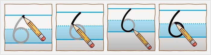 6 rakamını yazarken ilk önce üst çizgiden başlayarak soldan aşağıya doğru kavisli bir çizgi çizelim. Elimizi kaldırmadan orta çizgiler ile alt çizgi arasına bir yuvarlak çizelim. 6 rakamını yazarken elimizi hiç kaldırmıyoruz.