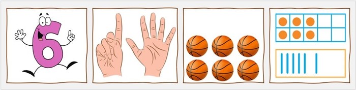 6 sayısı sol elin tüm parmakları açık; sağ elin işaret parmağı açık, diğerleri kapalı olacak şekilde gösterilir. 6 sayısı ile şekilde gösterilen toplar ifade edilebilir, 6 tane basketbol topu.