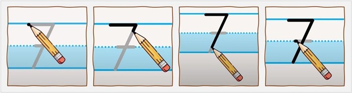 7 rakamını yazarken ilk önce üst çizgiden başlayarak sağa doğru düz bir çizgi çizelim. Elimizi kaldırmadan alt çizgiye kadar sola doğru eğik bir çizgi daha çizelim. Elimizi kaldırıp son olarak orta çizgide soldan sağa doğru düz bir çizgi çizelim. 7 rakamını yazarken elimizi bir defa kaldırıyoruz.