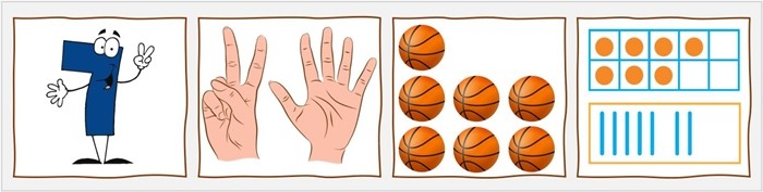 7 sayısı sol elin tüm parmakları açık; sağ elin işaret ve orta parmakları açık, diğerleri kapalı olacak şekilde gösterilir. 7 sayısı ile şekilde gösterilen toplar ifade edilebilir, 7 tane basketbol topu.