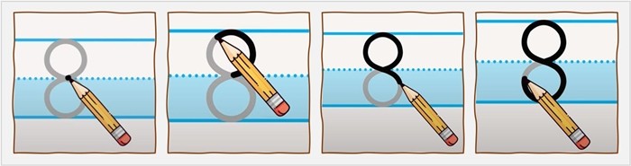 8 rakamını yazarken ilk önce orta çizgiden başlayarak üst çizgiye kadar bir yuvarlak çizelim. Elimizi kaldırmadan alt çizgiye kadar da bir yuvarlak daha çizelim. 8 rakamını yazarken elimizi hiç kaldırmıyoruz.