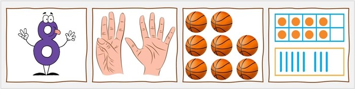 8 sayısı sol elin tüm parmakları açık; sağ elin işaret, orta ve yüzük parmakları açık, diğerleri kapalı olacak şekilde gösterilir. 8 sayısı ile şekilde gösterilen toplar ifade edilebilir, 8 tane basketbol topu.