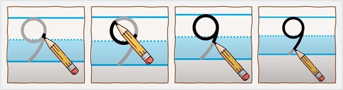 9 rakamını yazarken ilk önce orta çizginin az yukarısından başlayarak üst çizgi ile orta çizgi arasında bir yuvarlak çizelim. Daha sonra elimizi kaldırmadan alt çizgiye kadar da eğimli bir çizgi çizelim. 9 rakamını yazarken elimizi hiç kaldırmıyoruz.