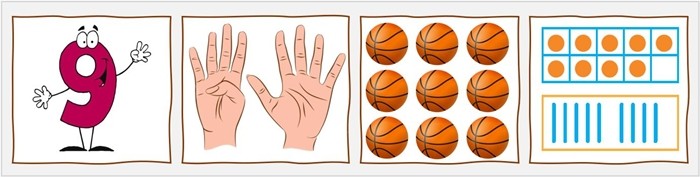 9 sayısı sol elin tüm parmakları açık; sağ elin sadece baş parmağı kapalı, diğerleri açık olacak şekilde gösterilir. 9 sayısı ile şekilde gösterilen toplar ifade edilebilir, 9 tane basketbol topu.