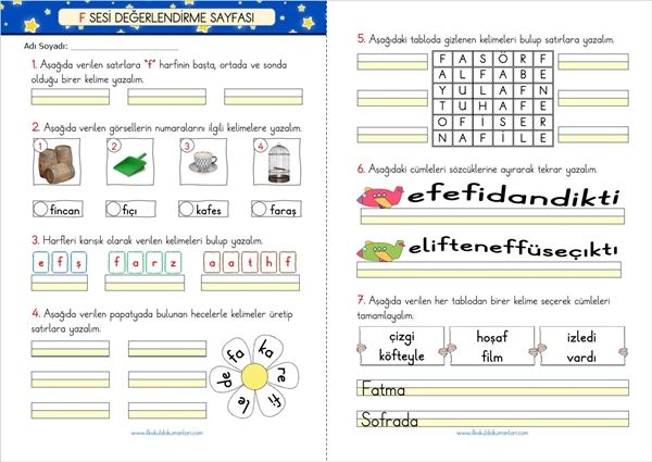 - F sesi içeren karışık harflerde gizlenen kelimeleri bulup yazma,