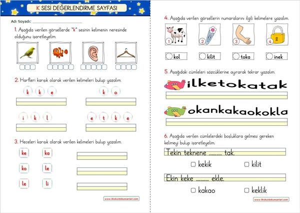 - K sesi içeren karışık hecelerde gizlenen kelimeyi bulup yazma,