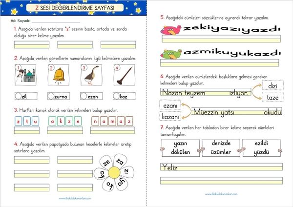 • Z sesi içeren karışık harflerde gizlenen kelimeleri bulup yazma,